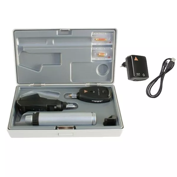 Набор оснащен удобной ручкой Heine BETA 4 USB с литий-ионными элементами питания. Заряд осуществляется быстро, емкость аккумулятора с течением времени не снижается. В комплект также входит трансформатор, с помощью которого зарядка батареи производится от сети.